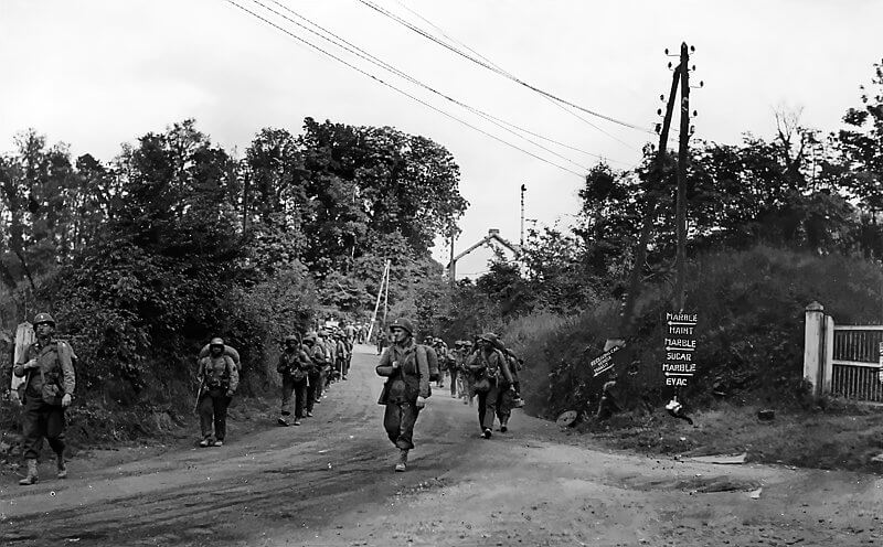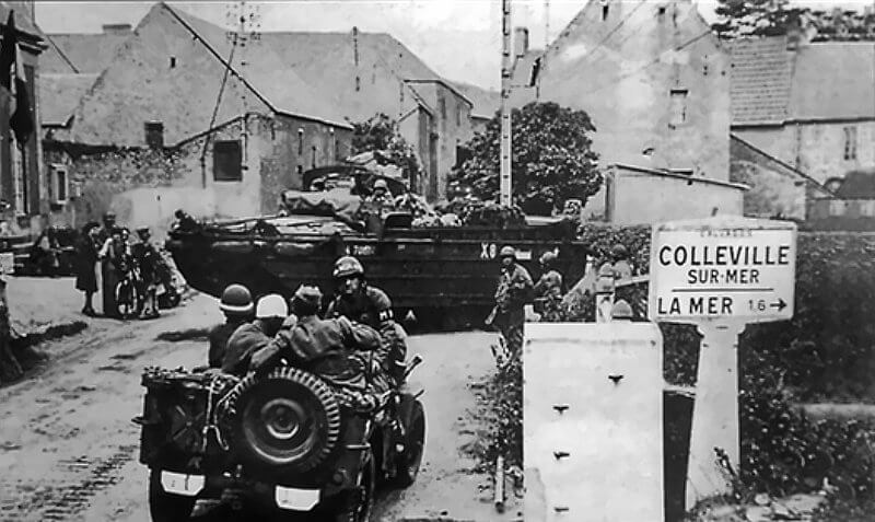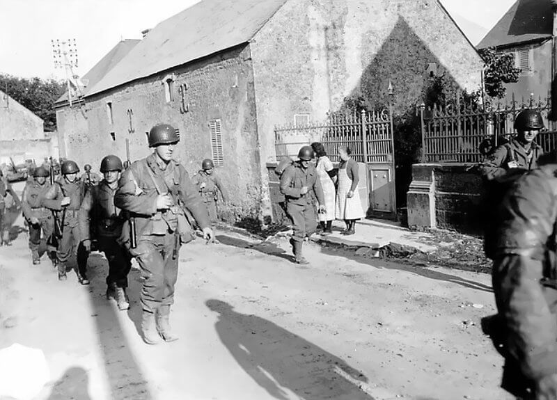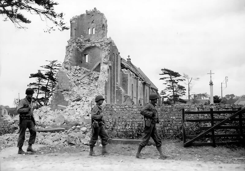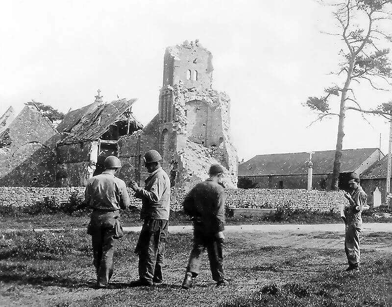 The church becomes a target during the battle. Its prominent stone steeple is used as a landmark by Allied forces and sustains significant damage. Post-war repairs are still visible in the upper masonry, where shellfire hit the structure.