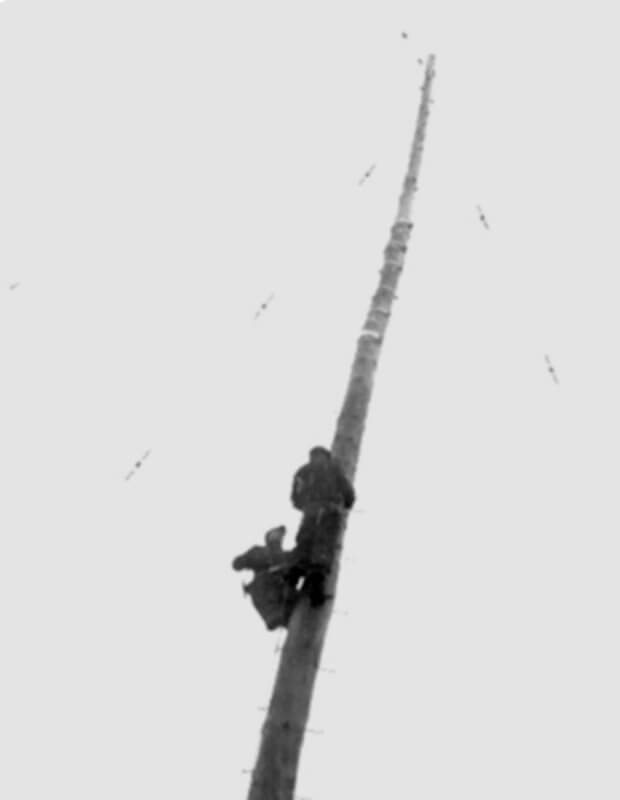 Between Thornton Road and Corbett Creek, three separate arrays of rhombic (diamond-shaped) aerials are suspended, each array strung across four telephone poles. The installation is overseen by Mr. Edmonds of Ontario Hydro, who is employed at the Camp. He is responsible for selecting the appropriate poles and supervising the construction of the system.