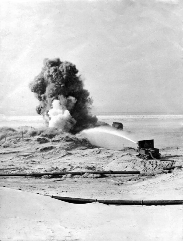 Bulldozers arrive first. With chains they drag out old wooden posts left from 1940 invasion defences. Mines and barbed wire, laid when Britain expected a German landing, are cleared. New roads are built. A rough log track, soon known as the “Corduroy Road”, links Marine Drive to Putsborough. From the village, Bay View Road is joined to Rockfield Road. A steep track, the “Big Dip”, is cut to haul supplies from the beach. Paths are carved down from Marine Drive to the golf links. New pillboxes and wire entanglements are erected for assault practice.
