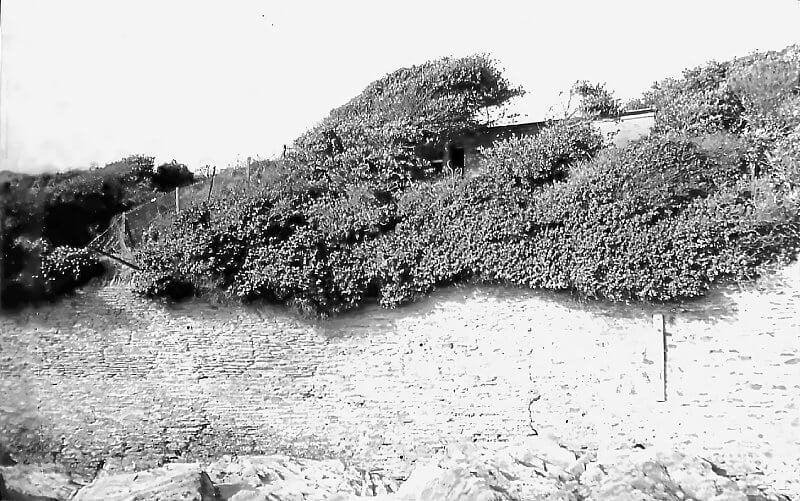 Estuary Blue II extends along the north shore of Broadsands from the White House almost to the beach access road near today’s car park. This is one of the main embarkation training sites. Structures for embarkation and landing are built along the strand. At the top of the beach, a lateral concrete wall survives, scarred with blast damage. Scattered obstacles remain in the sand, also showing explosion marks from live demolitions. At the White House, the Americans construct a concrete slipway, which still exists.