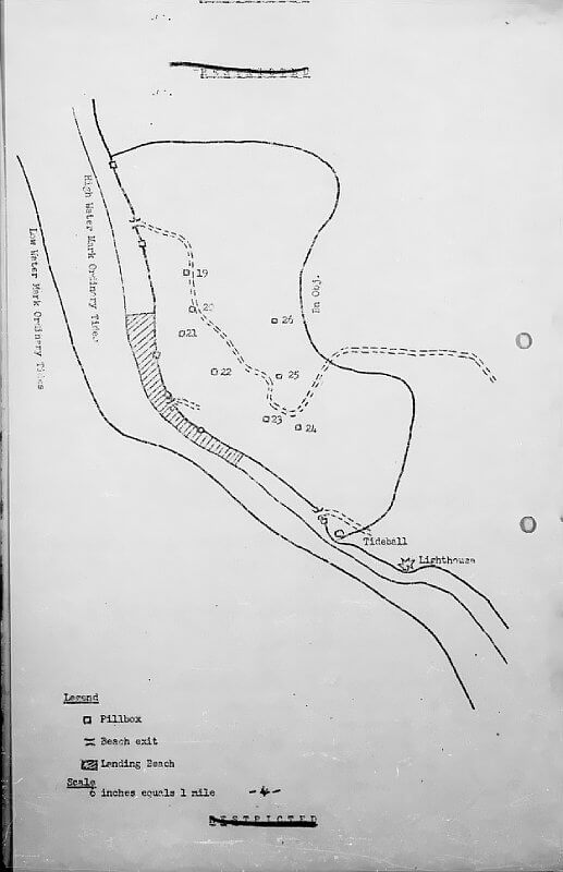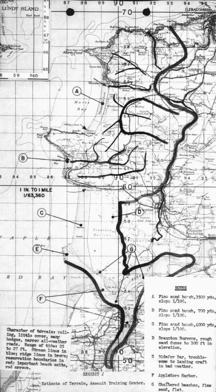 Estuary Blue I runs along the seaward side of Crow Neck to Crow Point. This stretch of shoreline is later eroded heavily by the sea, but during 1943–44 it serves as a key training beach.