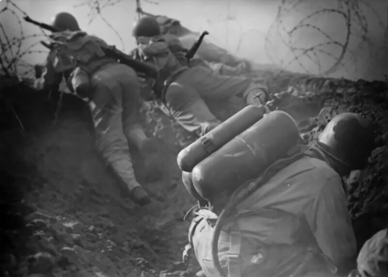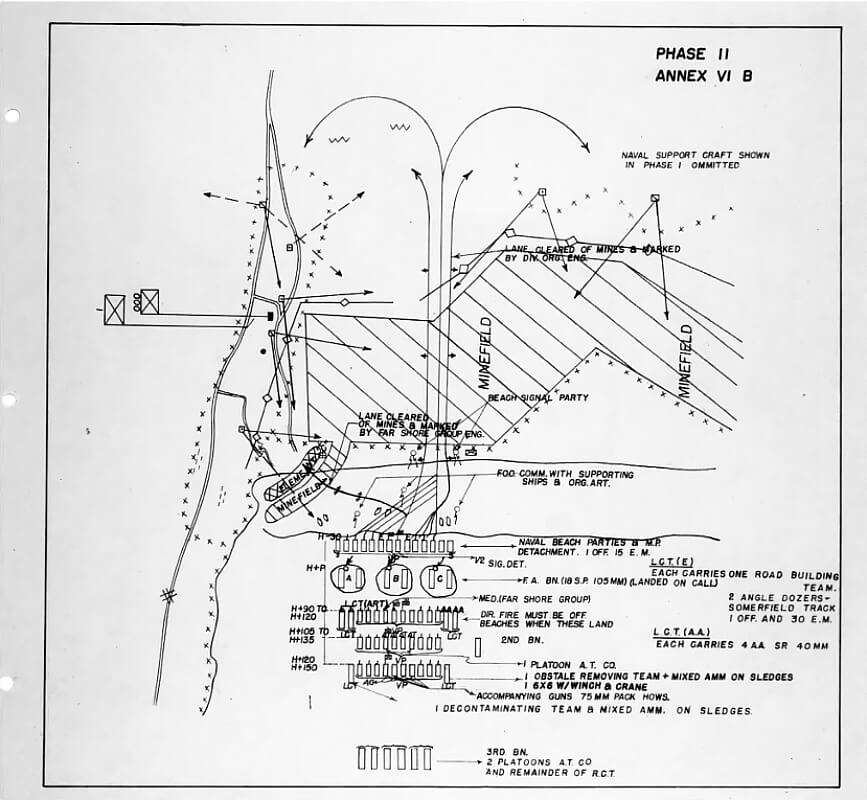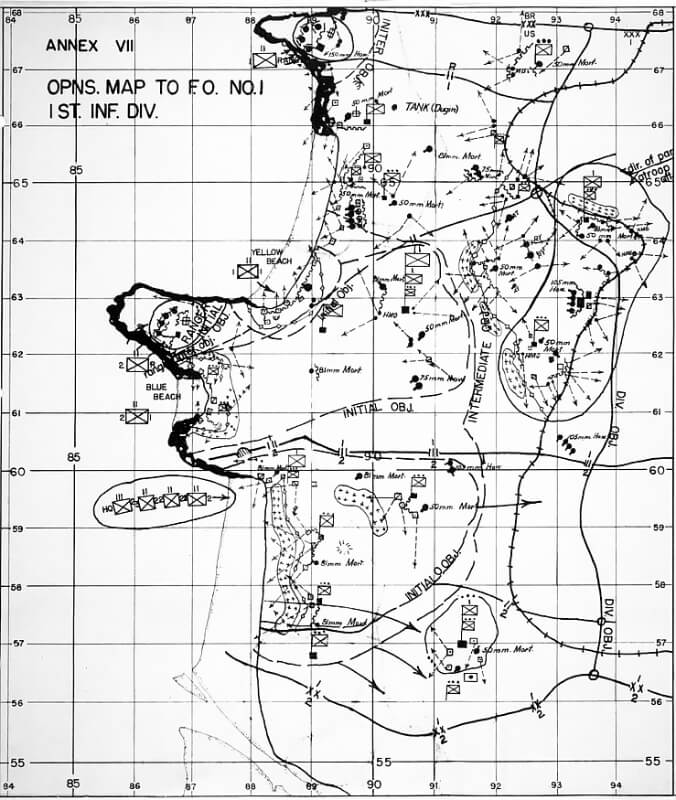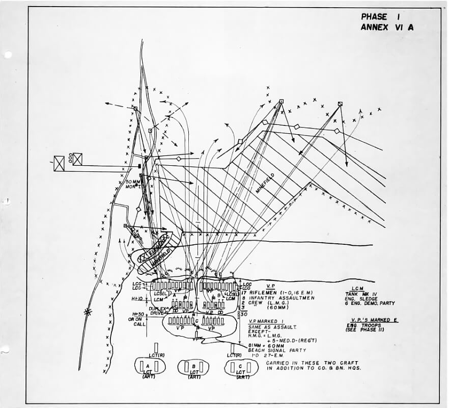 The exercise beach is laid out in a chequerboard of “problem areas.” Each square contains a different obstacle or challenge. One may hold a mined wire entanglement. Another may contain a mock concrete bunker. A third may hold flooded ditches. Assault sections move square to square, clearing each in sequence.