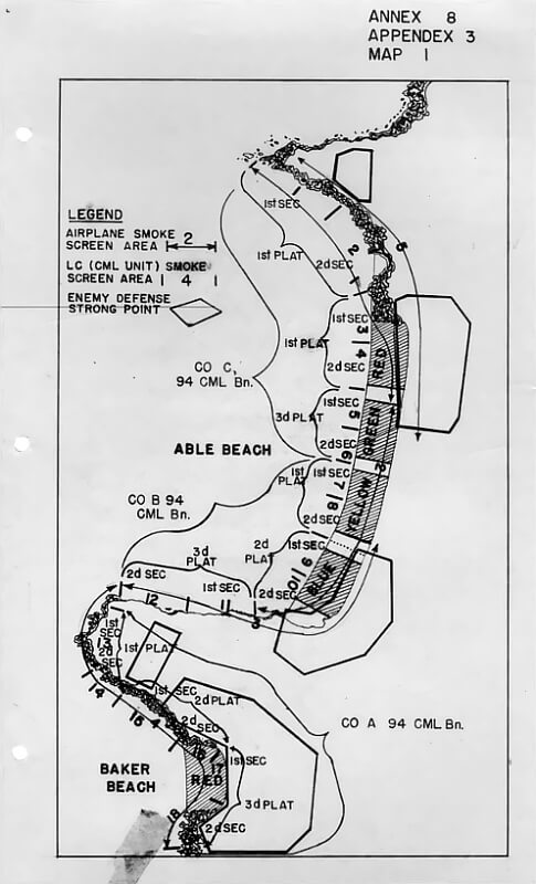 As the ramps drop, assault troops dash into the surf. Engineers wade forward with mine detectors and Bangalore torpedoes. Barbed wire is cut or blown apart. Wooden stakes and hedgehogs are destroyed with demolition charges. Infantry squads provide covering fire as engineers clear the way. Bazooka and flamethrower teams attack dummy pillboxes. Mortar crews give smoke cover as units push off the sand.