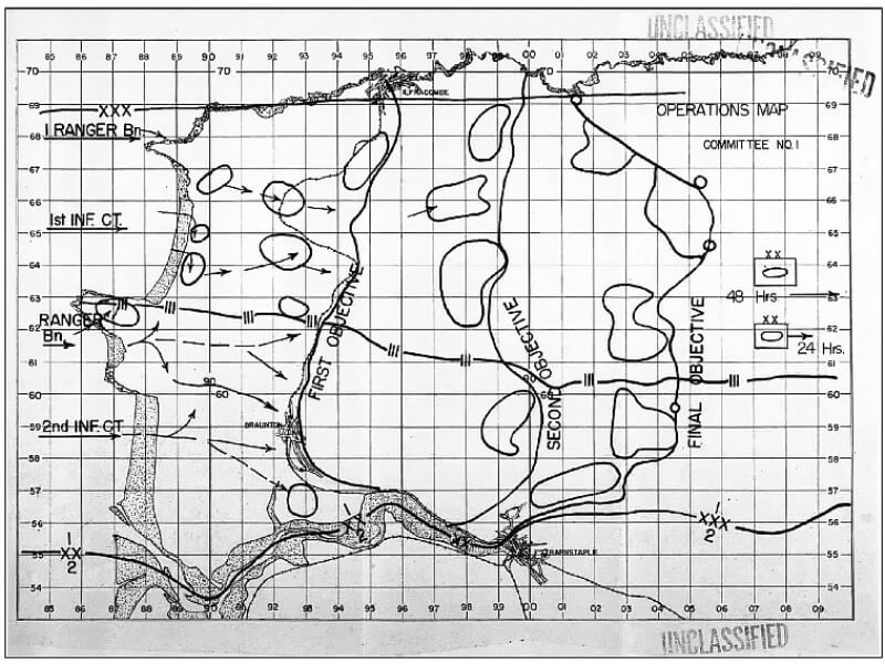 By May 1943, after a month-long conference, Thompson’s team completes its work. It draws on British, Canadian, and American experience, including lessons from the failed Dieppe raid. The new doctrine sets out the principles for attacking a defended coast. It notes the unique conditions of the American sectors. Omaha Beach is defined by steep bluffs and narrow exits. Utah Beach is bordered by flooded marshes and dunes. Unlike British and Canadian sectors, where tanks can drive directly inland, U.S. troops must fight their way clear before armour can land. Infantry and engineers must therefore learn to destroy obstacles and neutralise strongpoints with only the tools they carry ashore.
