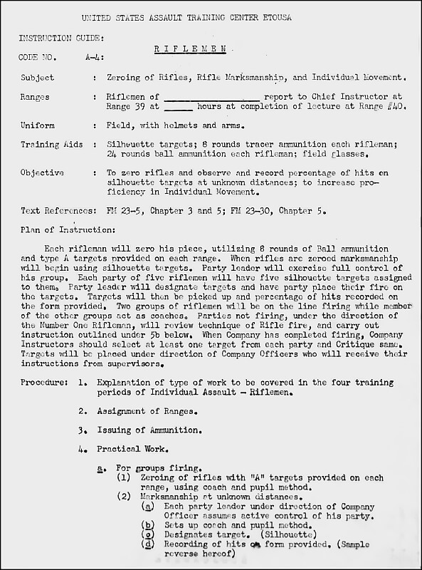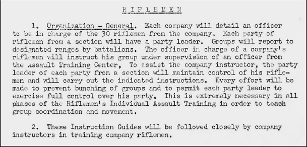 The training procedures for assault and support sections goes as followed. Weapons of the assault sections fall into two groups. Supporting weapons include rifles, Browning Automatic Rifles, machine guns, and mortars. These are already familiar to infantry units. Company officers are responsible for training in their use. They are provided with instruction guides, advisers from the Assault Training Centre staff, and suitable training aids. Officers must prepare daily instruction based on the guides. They are expected to carry the guides at all times for reference. Infantrymen armed with these weapons must become fully proficient in their operation and care.