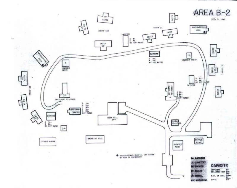 Camp B-2, known today as Camp Greentop, consists during the war years of a collection of rustic chestnut cabins, a mess hall with adjoining kitchen, a recreation hall, a headquarters building, and a swimming pool. The pool is drained and covered over during wartime operations, remaining unused for the duration. The camp is divided into four groups of cabins, each served by a latrine block with toilets and wash basins. At first, there is no provision for hot water.
