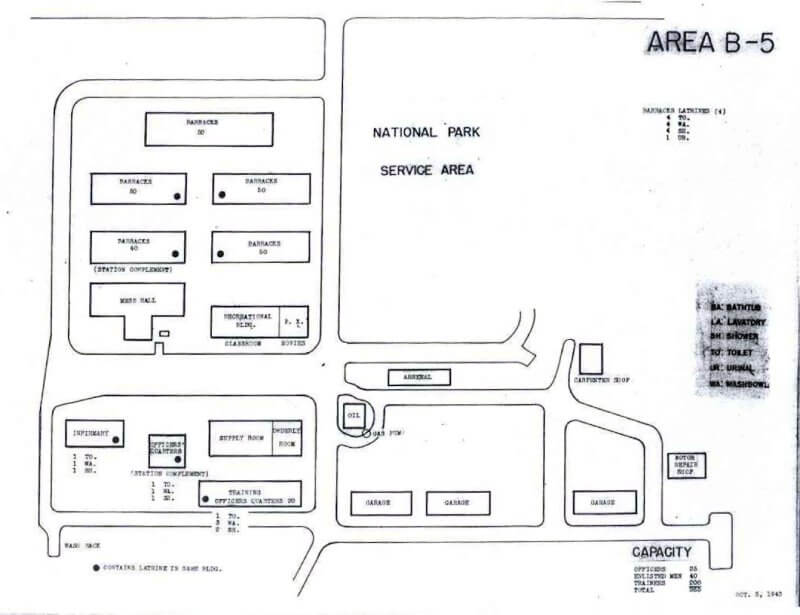 The site benefits from existing infrastructure, cabins, dining halls, kitchens, and various facilities constructed during the late 1930’s by the Works Progress Administration, as well as a nearby Civilian Conservation Corps work camp. These installations enable Training Area B to accommodate up to three hundred trainees, in addition to a station cadre comprising seventy-five staff members and instructors.