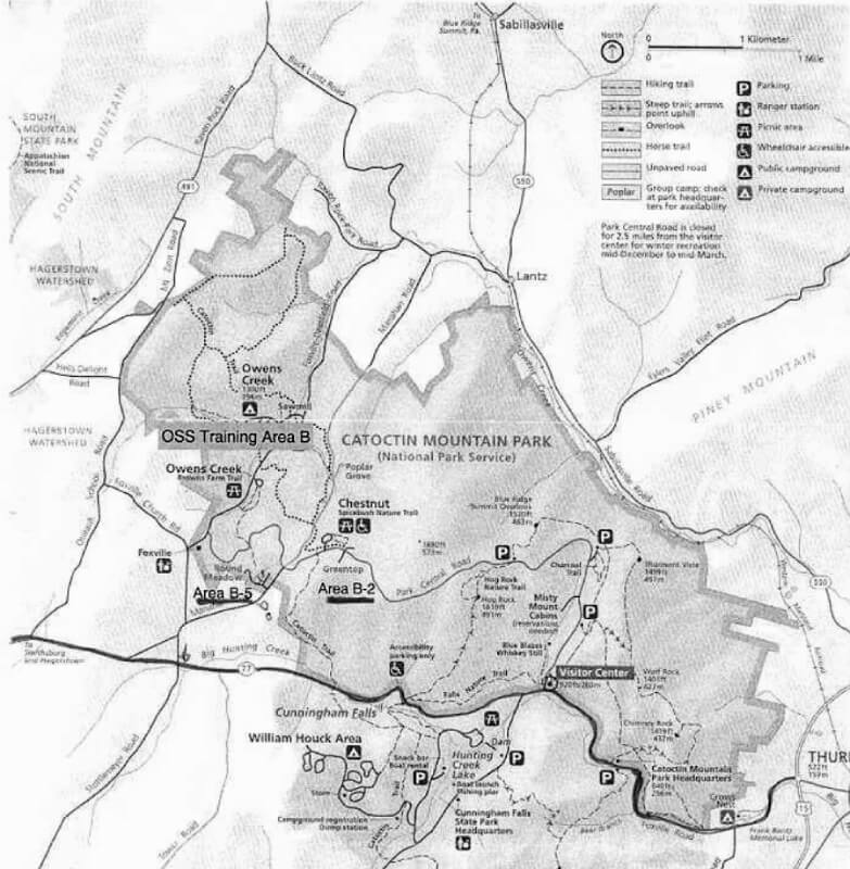 Catoctin Recreational Demonstration Area (Now Catoctin Mountain Park), situated north of Frederick in Maryland, is a forested, mountainous region covering approximately 3,600 hectares and lying around 120 kilometres north of Washington, D.C. It is selected as the initial site for the Office of Strategic Services basic paramilitary training for both Special Operations and Secret Intelligence personnel. The location is officially designated as Training Area B, reflecting its role as the base for the preliminary paramilitary instruction.