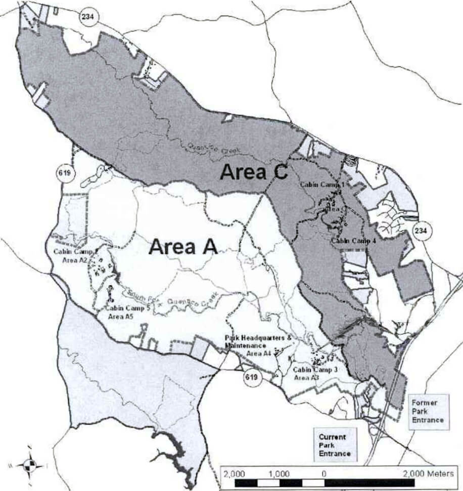 Area C comprises two cabin camps located approximately 400 metres apart in the northeast section of the park, between Quantico Creek and the Dumfries-Manassas Road). The main gate stands off Dumfries Road and is heavily guarded; access is restricted to authorised personnel. Taxicabs from nearby Triangle often deliver Office of Strategic Services staff and trainees, but are not permitted beyond the gate.