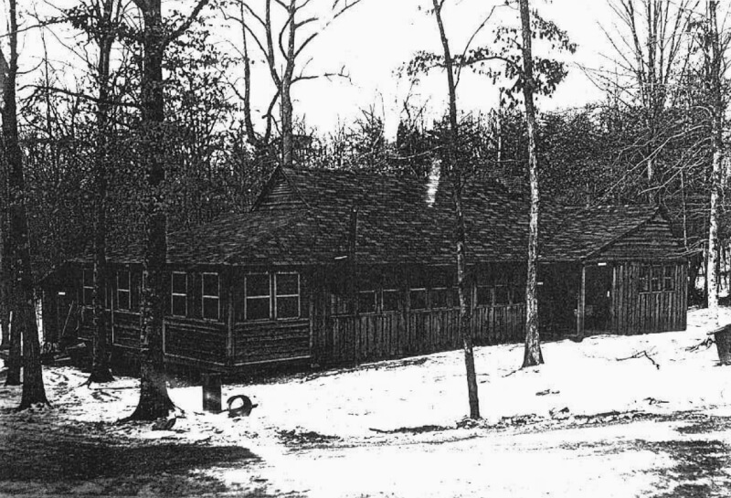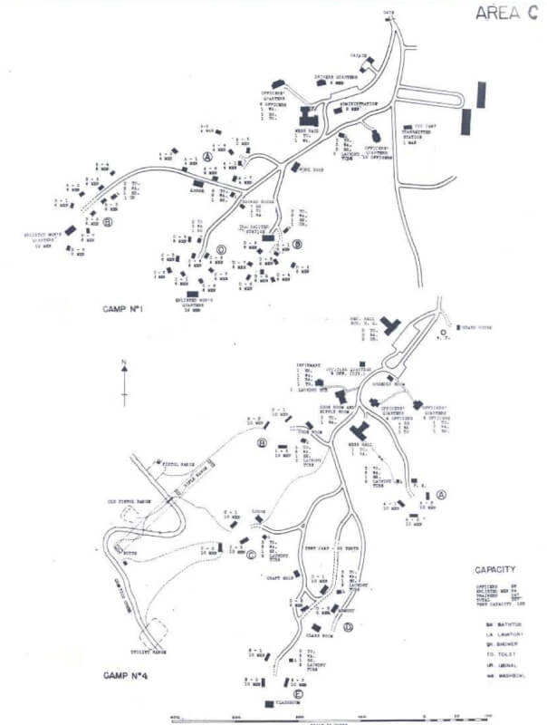 Area C-4 is larger than C-1 and comprises five sub-units, A through E, each with its own lodge. A central administrative zone and dining hall serve the entire camp. During winter of 1942, 1943, all buildings are winterised. Kitchen upgrades match those in other parts of the park. Building 78 is converted into the Office of Strategic Services code room. Latrines and the infirmary are expanded, and a large multi-purpose building is constructed with Donovan’s personal approval. This building serves as a venue for training films, lectures, and social events, and still stands today.