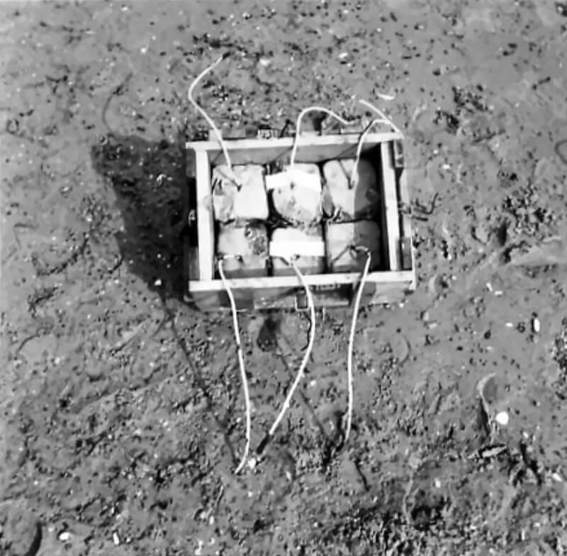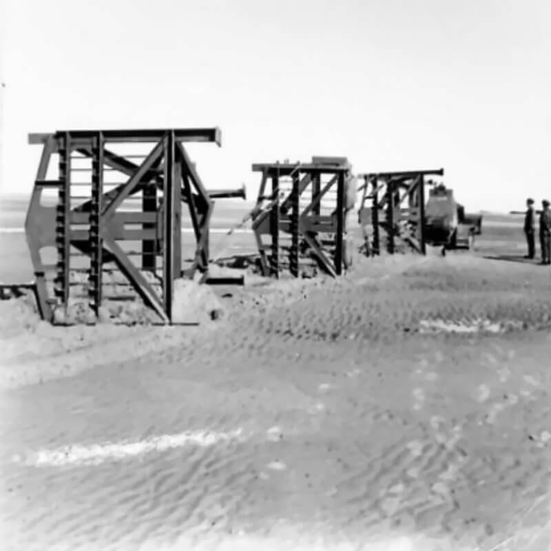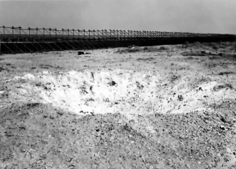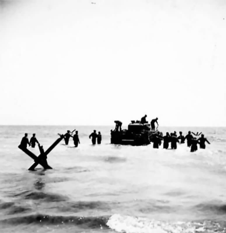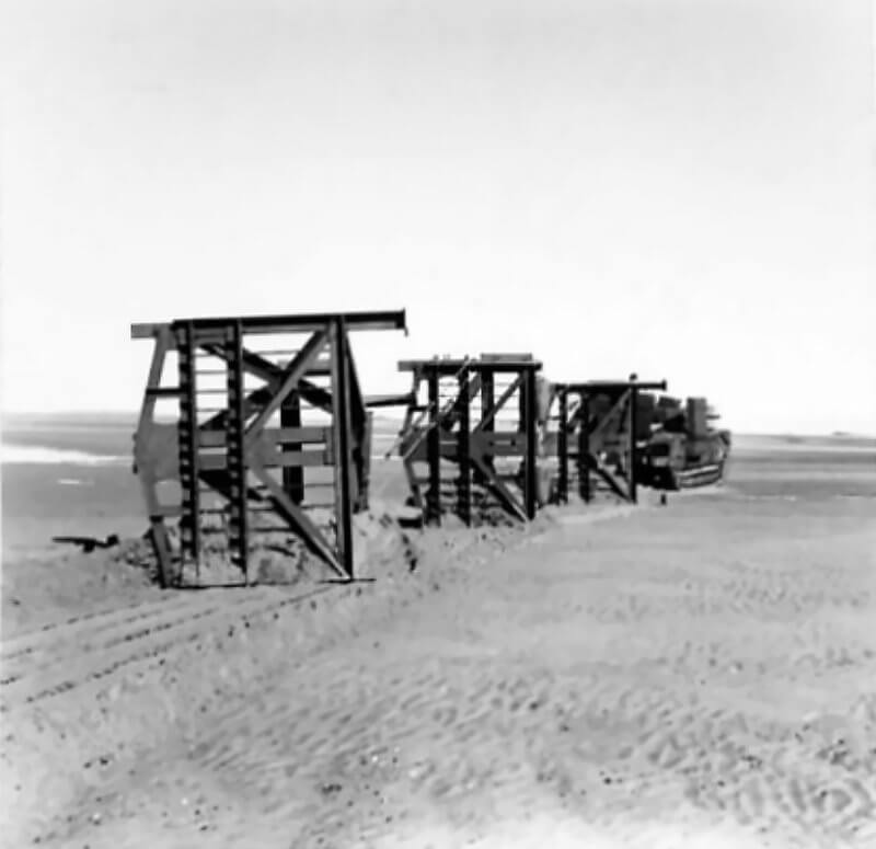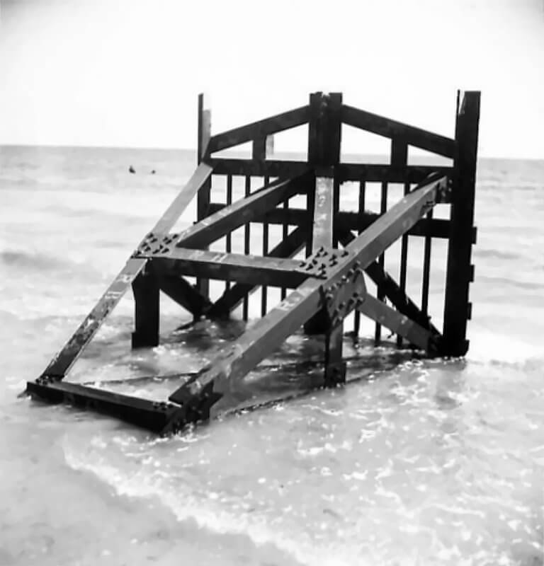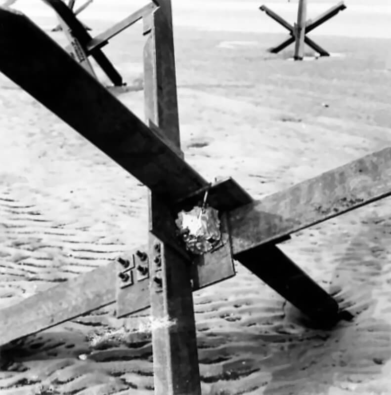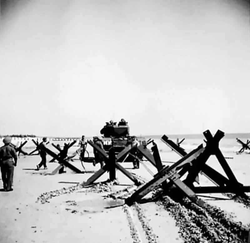 FLAIL TANKS (H 37423) Original wartime caption: 75 mm Shot at Tetrahedra result. Copyright: ý IWM. Original Source: http://www.iwm.org.uk/collections/item/object/205509215