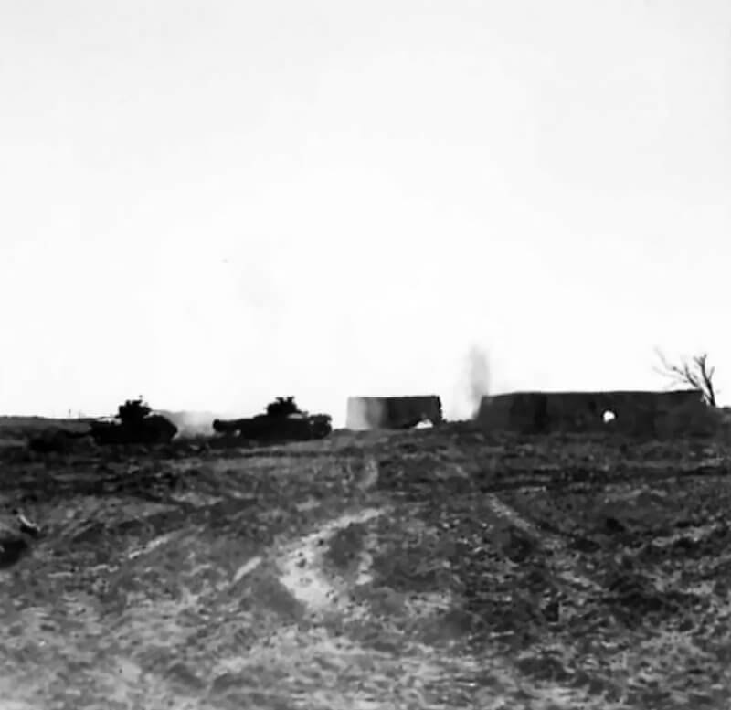 FLAIL TANKS (H 37422) Original wartime caption: 75 mm Shot at Tetrahedra result. Copyright: ý IWM. Original Source: http://www.iwm.org.uk/collections/item/object/205509214