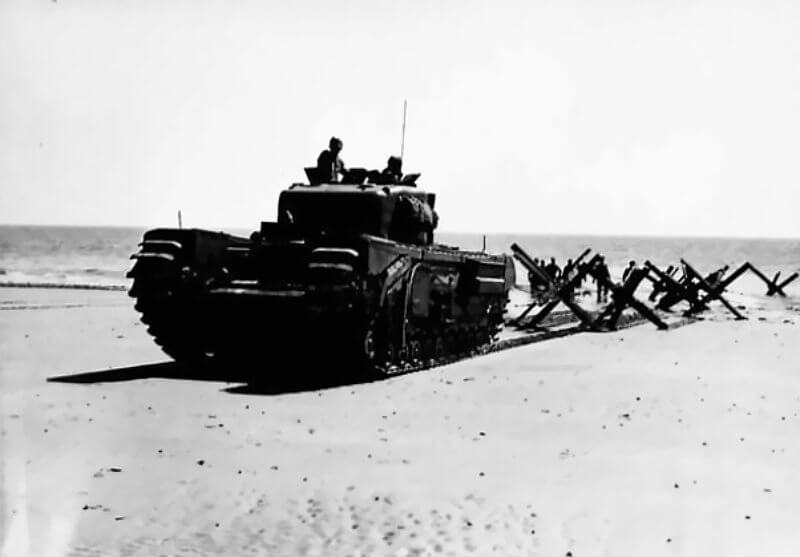 FLAIL TANKS (H 37417) Original wartime caption: Churchill tank charges on Tetrahedra Defence Post. Copyright: ý IWM. Original Source: http://www.iwm.org.uk/collections/item/object/205509209