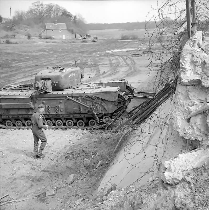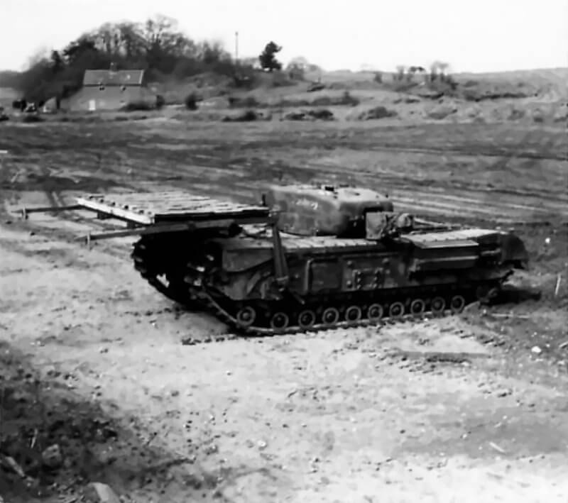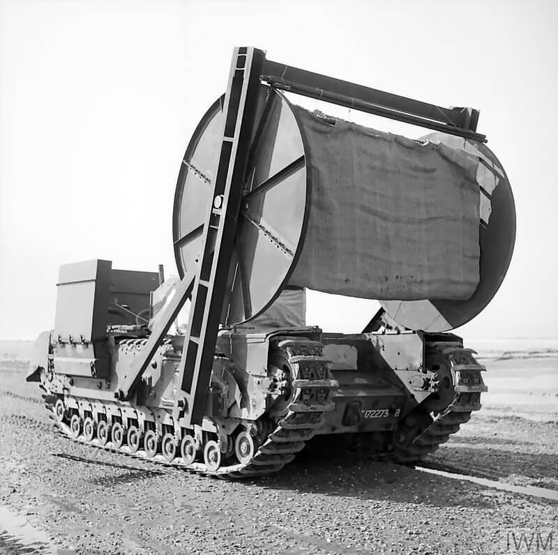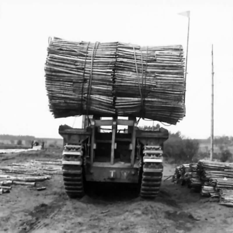 FLAIL TANKS (H 37471) Original wartime caption: Churchill tank carrying fascines. Copyright: ý IWM. Original Source: http://www.iwm.org.uk/collections/item/object/205509260