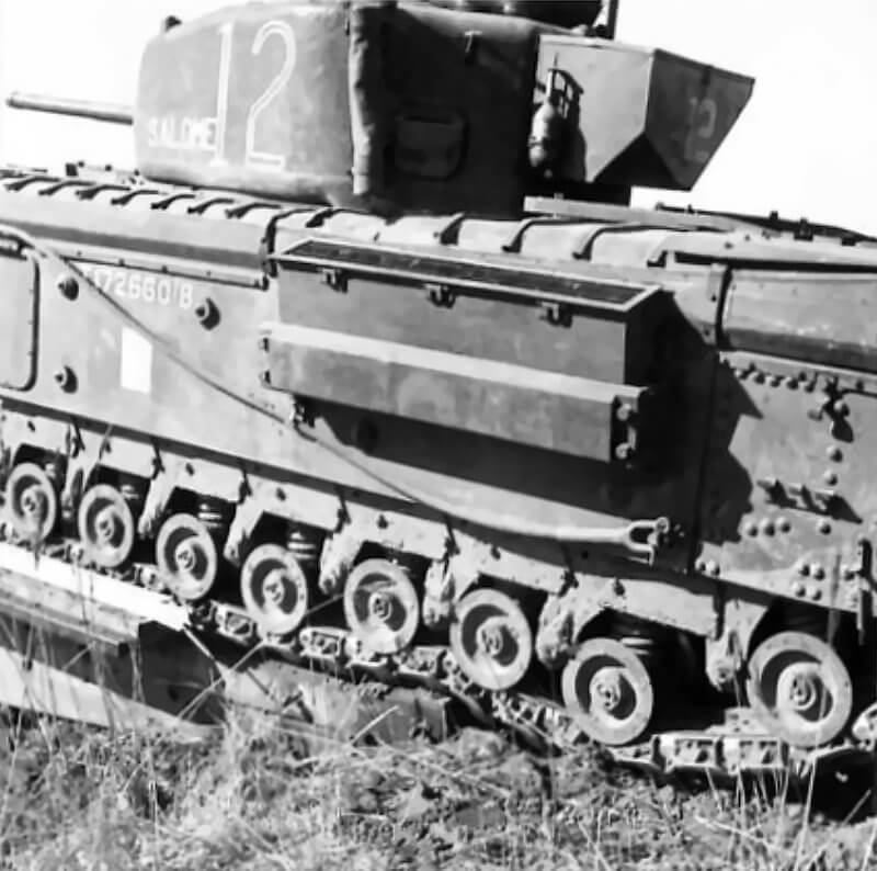 FLAIL TANKS (H 37414) Original wartime caption: Churchill tank and Bobbin [empty]. Copyright: ý IWM. Original Source: http://www.iwm.org.uk/collections/item/object/205509206