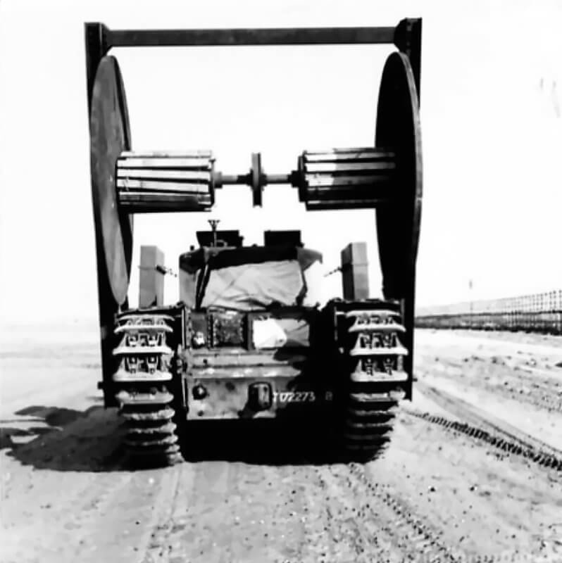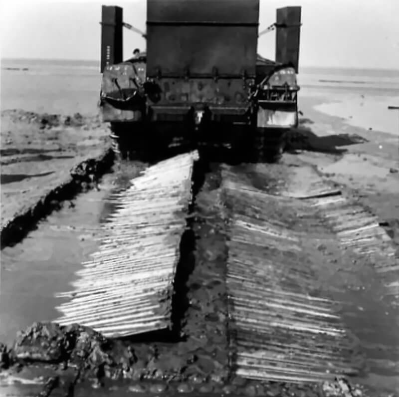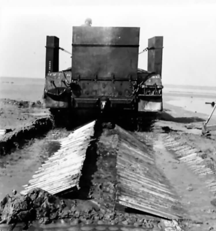 FLAIL TANKS (H 37443) Original wartime caption: Unrolling mat pulling showing mat laid Copyright: ý IWM. Original Source: http://www.iwm.org.uk/collections/item/object/205509233