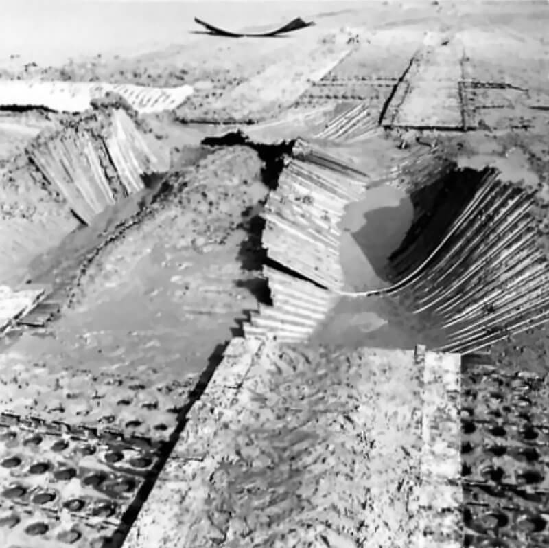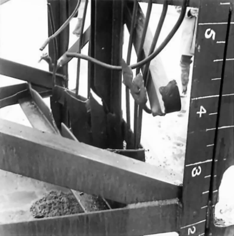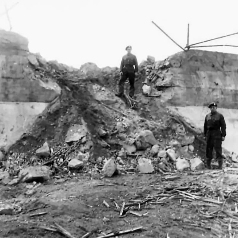 FLAIL TANKS (H 37469) Original wartime caption: The damaged concrete wall after exploding trial. Copyright: ý IWM. Original Source: http://www.iwm.org.uk/collections/item/object/205509258
