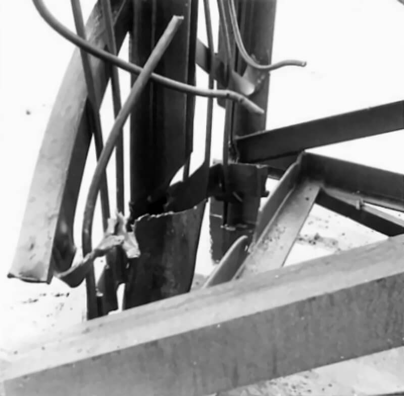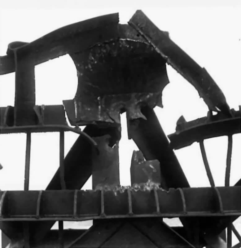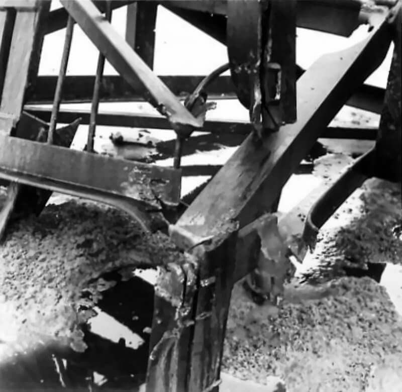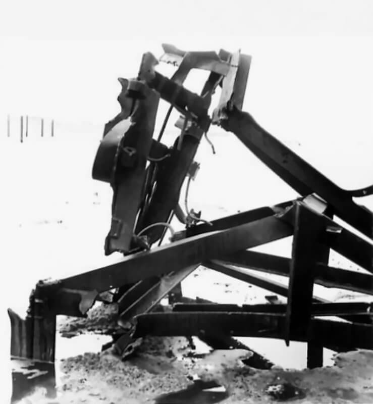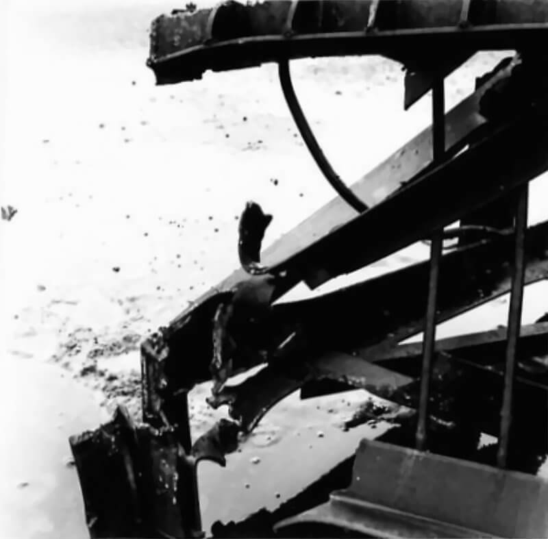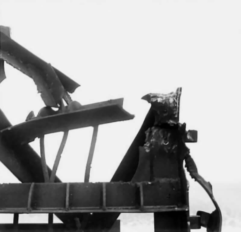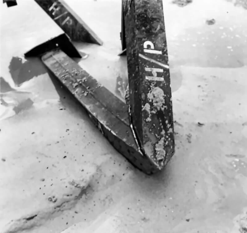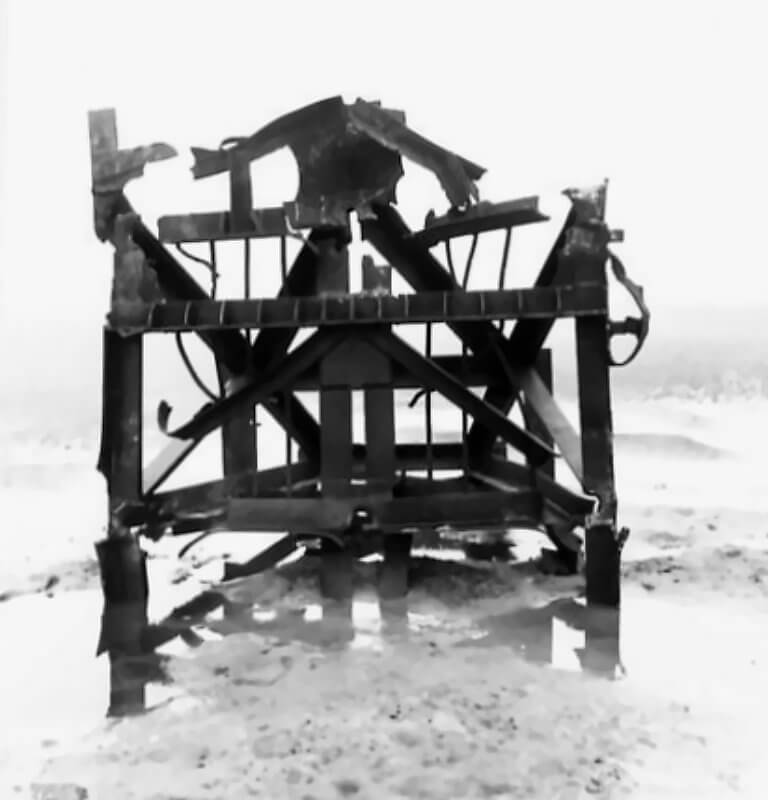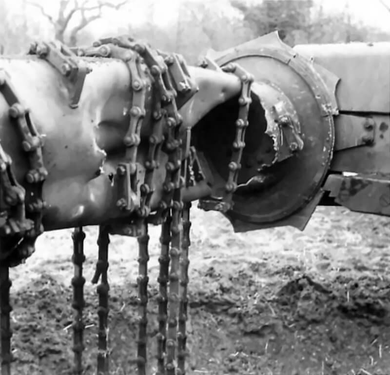 FLAIL TANKS (H 37420) Original wartime caption: Effect of Chruchill charge damaged base plate and arms. Copyright: ý IWM. Original Source: http://www.iwm.org.uk/collections/item/object/205509212