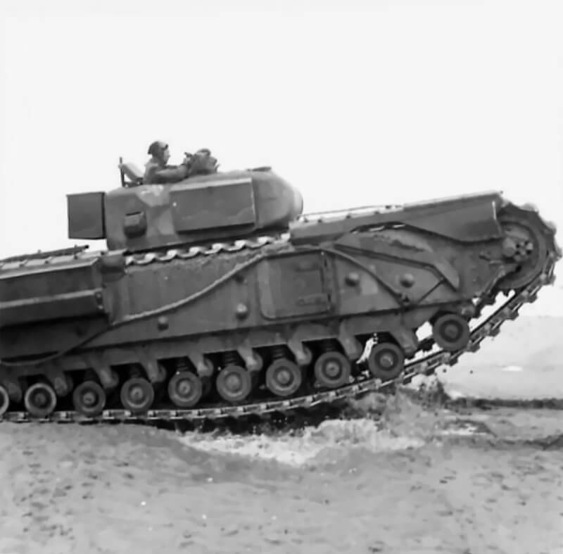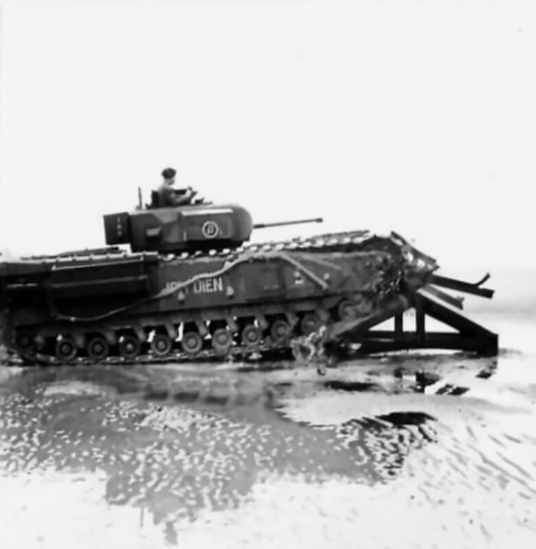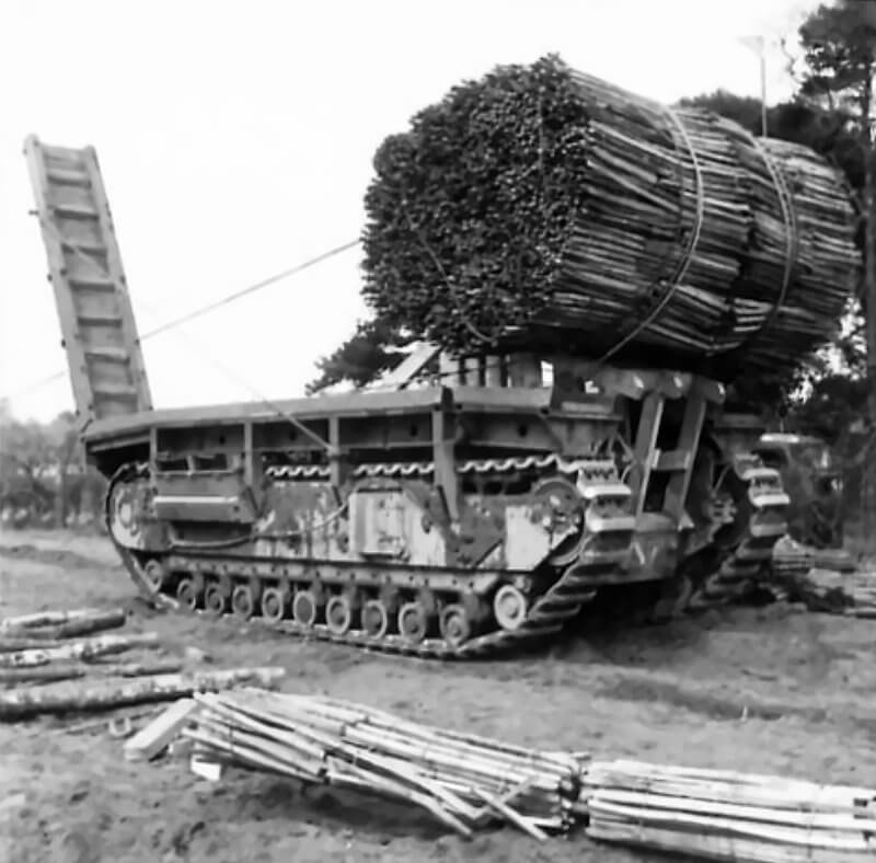 FLAIL TANKS (H 37473) Original wartime caption: Churchill tank carrying fascines. Copyright: ý IWM. Original Source: http://www.iwm.org.uk/collections/item/object/205509261
