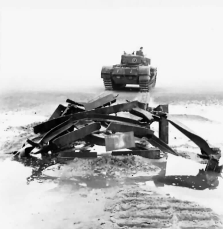 FLAIL TANKS (H 37467) Original wartime caption: Churchill tank carrying ‘goat’ and change in position before exploding trial. Copyright: ý IWM. Original Source: http://www.iwm.org.uk/collections/item/object/205400472