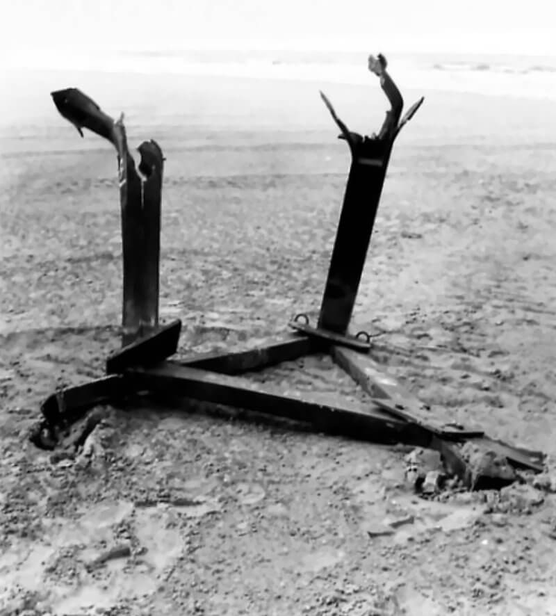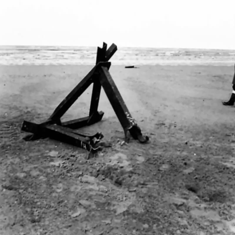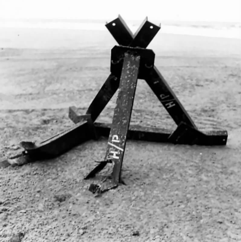 FLAIL TANKS (H 37423) Original wartime caption: 75 mm Shot at Tetrahedra result. Copyright: ý IWM. Original Source: http://www.iwm.org.uk/collections/item/object/205509215