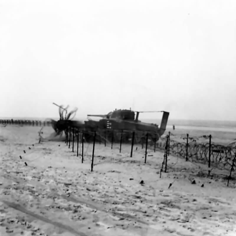 FLAIL TANKS (H 37433) Original wartime caption: Fence being destroyed. Copyright: ý IWM. Original Source: http://www.iwm.org.uk/collections/item/object/205509223