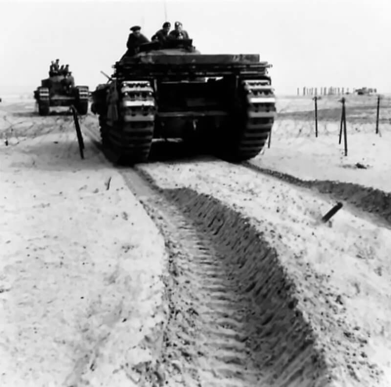 FLAIL TANKS (H 37432) Original wartime caption: Grapels pulled by two Churchills tear down fence. Copyright: ý IWM. Original Source: http://www.iwm.org.uk/collections/item/object/205509222