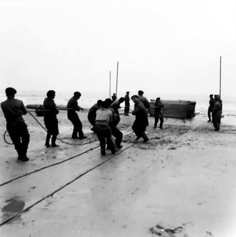 FLAIL TANKS (H 37434) Original wartime caption: Close up of fence being pulled by grapels. Copyright: ý IWM. Original Source: http://www.iwm.org.uk/collections/item/object/205509224