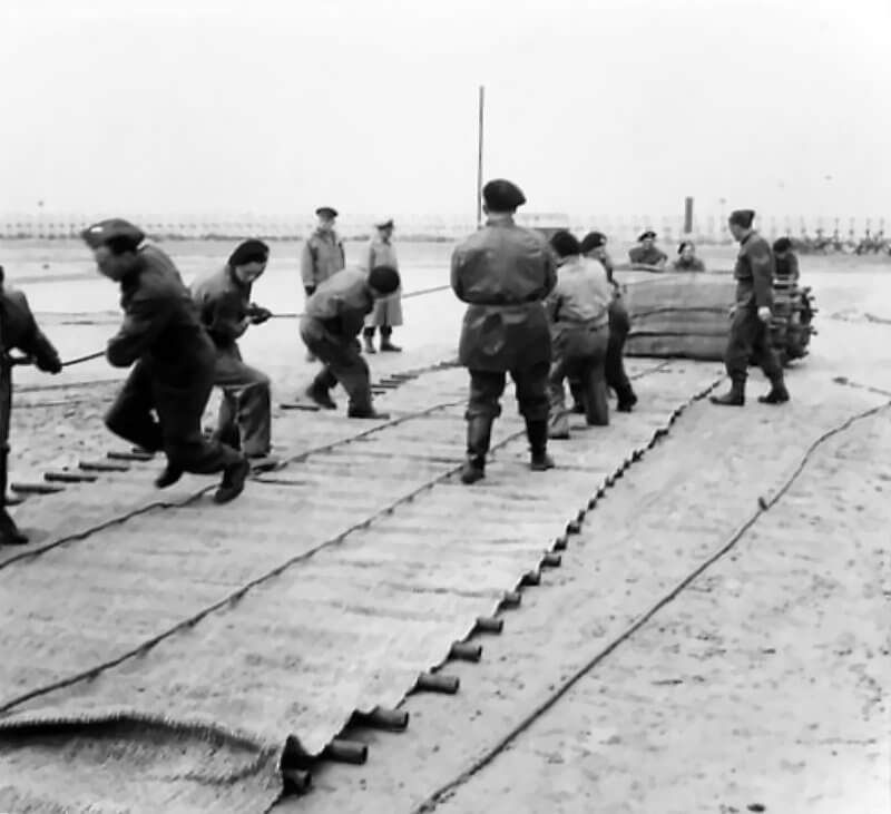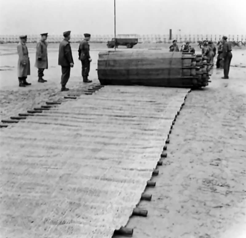 FLAIL TANKS (H 37413) Original wartime caption: The length of mat laid by Churchill tank with Bobbin. Copyright: ý IWM. Original Source: http://www.iwm.org.uk/collections/item/object/205509205