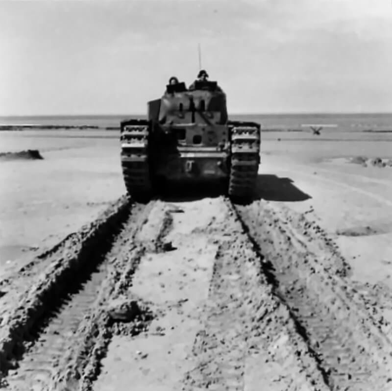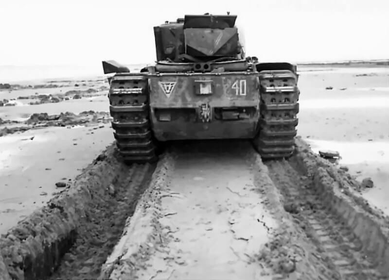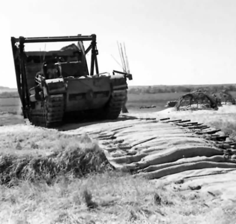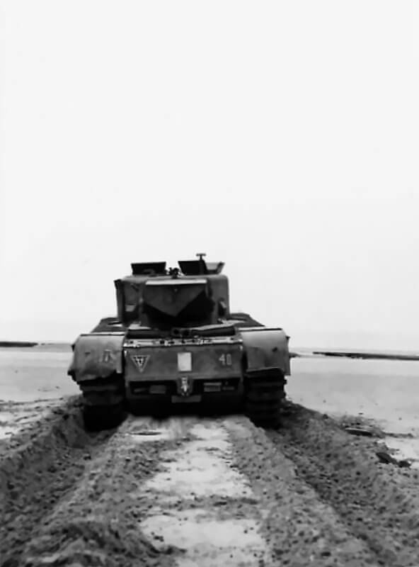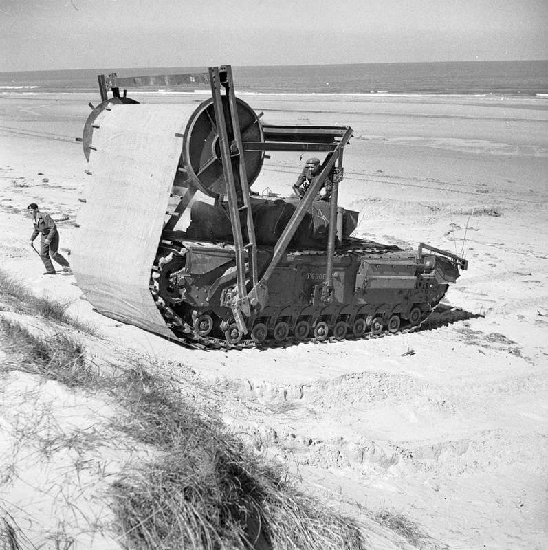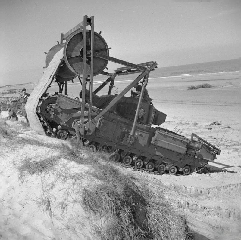 FLAIL TANKS (H 37443) Original wartime caption: Unrolling mat pulling showing mat laid Copyright: ý IWM. Original Source: http://www.iwm.org.uk/collections/item/object/205509233