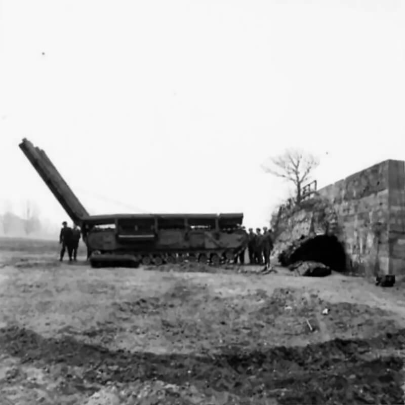 FLAIL TANKS (H 37469) Original wartime caption: The damaged concrete wall after exploding trial. Copyright: ý IWM. Original Source: http://www.iwm.org.uk/collections/item/object/205509258