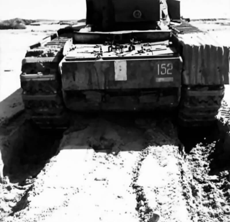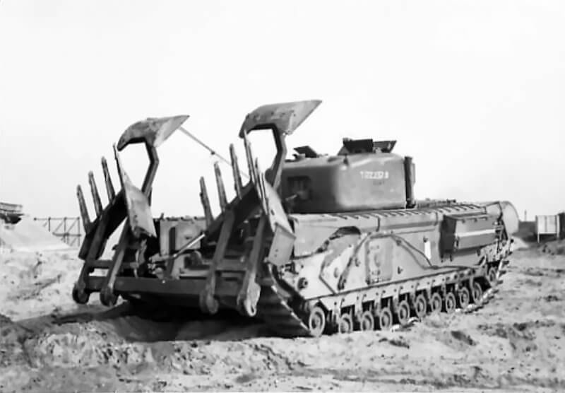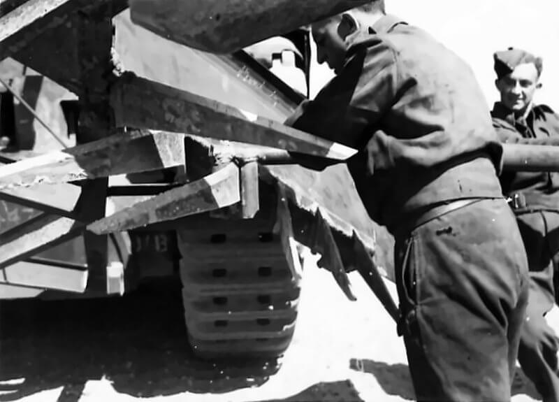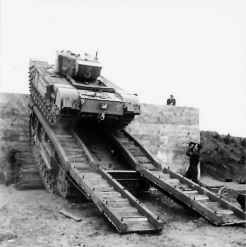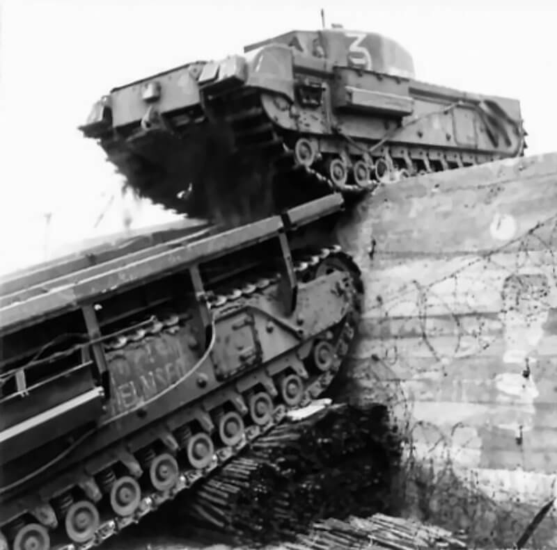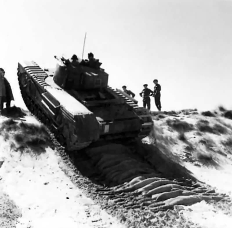 FLAIL TANKS (H 37471) Original wartime caption: Churchill tank carrying fascines. Copyright: ý IWM. Original Source: http://www.iwm.org.uk/collections/item/object/205509260