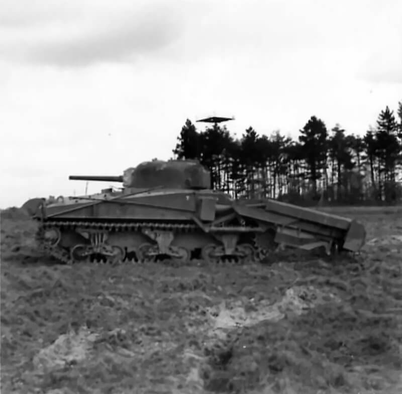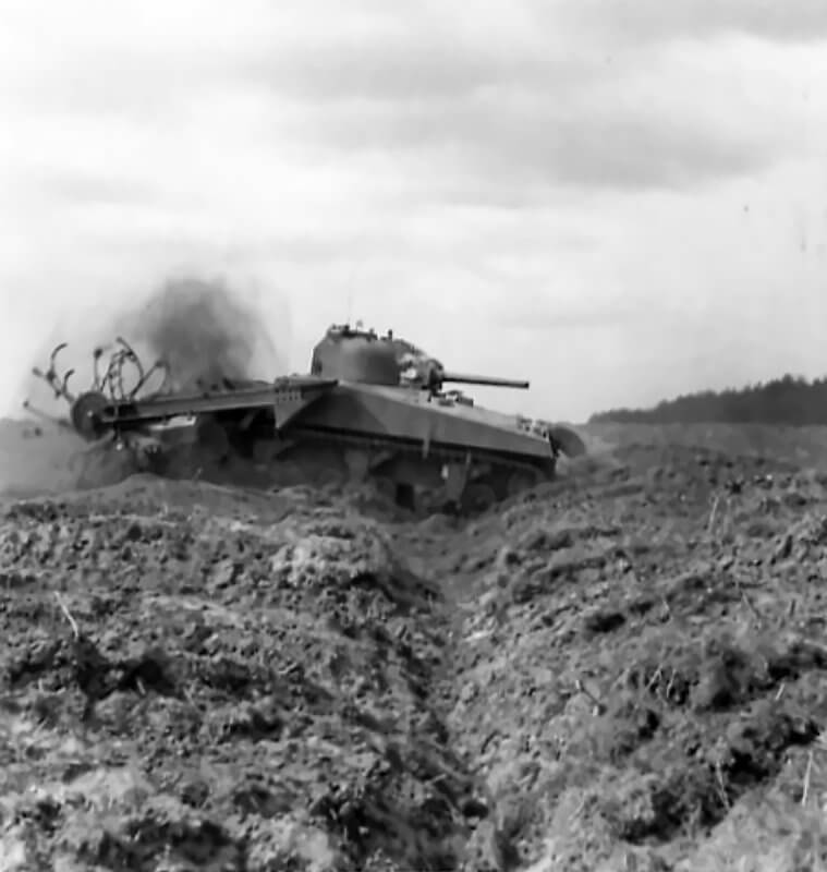 FLAIL TANKS (H 37406) Original wartime caption: Sherman tank fitted at Flails at work. Copyright: ý IWM. Original Source: http://www.iwm.org.uk/collections/item/object/205509200