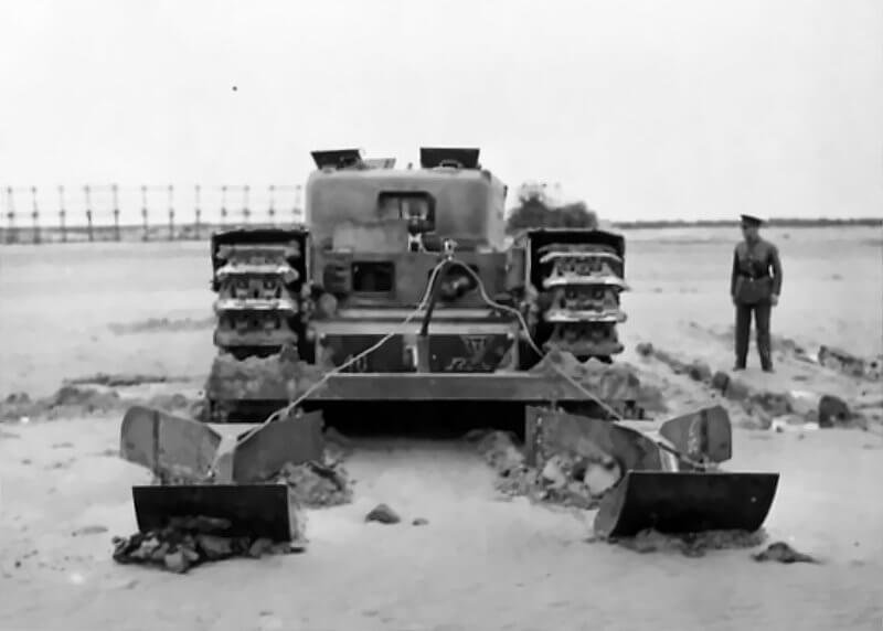 FLAIL TANKS (H 37467) Original wartime caption: Churchill tank carrying ‘goat’ and change in position before exploding trial. Copyright: ý IWM. Original Source: http://www.iwm.org.uk/collections/item/object/205400472