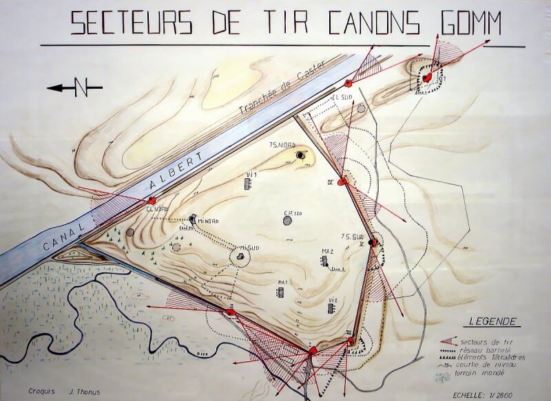 In 1933, Belgian engineers conduct a detailed analysis of the Maastricht enclave. Special emphasis is placed on bunker and casemate placement. Planning proceeds so construction can begin once the canal stretch between Kanne and Briegden is completed. Defensive bunkers are planned for the bridges at Kanne, Vroenhoven, and Veldwezelt. Large flanking casemates are also planned along the western bank. These are designated A, B, B’, C, and D.