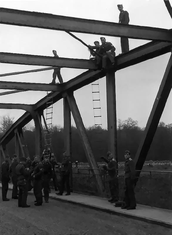 A second infiltration group consists of thirty men in civilian clothing. Three groups of ten men cross the border on the evening of May 9th, 1940, near Herzogenrath. They collect bicycles stored for them at Bleierheide. They also retrieve weapons previously hidden at Kerkrade. They then move towards the other two bridges in Maastricht.