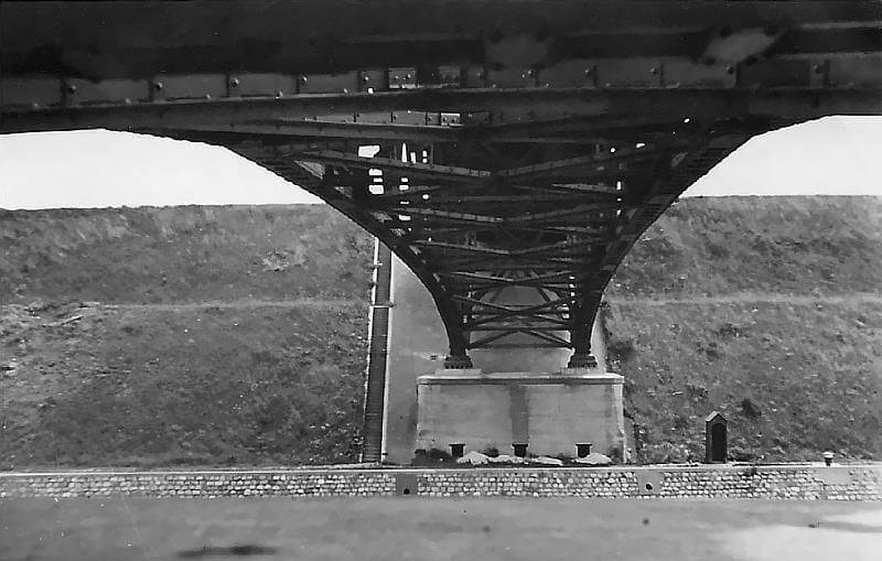 On the night of May 9th and May 10th, 1940, six men of 6e Compagnie under command of Caporal Andries maintain watch over the bridge at Veldwezelt. Two of these men are gendarmes from the Cyclistes Frontières volunteers. They do not know how to prime the demolition charges. For this reason, they are relieved at night. This differs from procedures at Vroenhoven. In practice, frontier security consists mainly of operating the barrier arm.