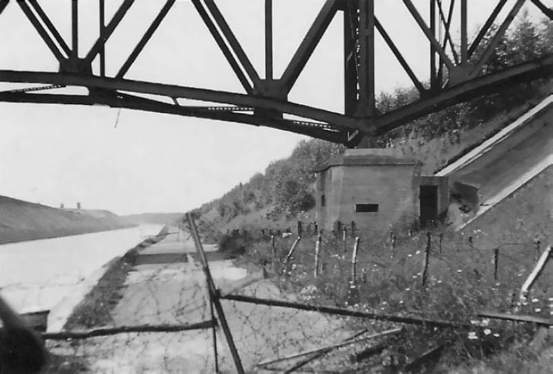 Unteroffizier Erich Rückriem leads Gruppe 9, consisting of one non-commissioned officer and eight men. His glider lands south of the Belgian trench system one hundred and fifty metres south-west of the bridge. The squad secures the western and south-western flanks. It monitors movement along the canal bank toward Vroenhoven. It provides cover for the men disarming the demolition charges on the bridge.
