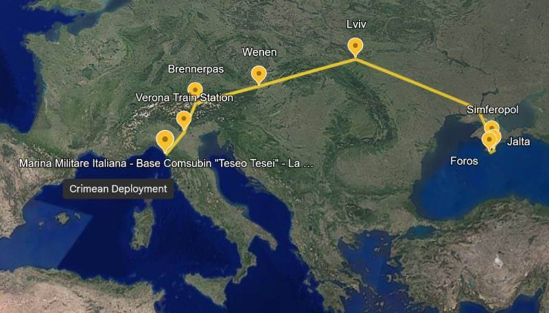 The Moccagatta convoy departs La Spezia, Italy on May 6th, 1942. The convoy is transferred onto a rail transport convoy in Verona, collecting the assault craft that have arrived there by rail. To bolster its defensive capability, two 20-millimetre anti-aircraft machine guns mounted on wheeled carriages are incorporated into the convoy’s armament. It then proceeds through Austria via the Brenner Pass. From there, it follows a route through Vienna, and Lviv, heading towards Crimea. Upon arrival in Simferopol, the capital city of Crimea, on May 19th, 1942, the vehicles are unloaded from the train. Here the convoy continues it’s journey by road, joining up with trucks arriving from other transfer points. On May 21st, 1942, the convoy, now consisting of 40 vehicles, moves through Yalta. On May 23rd, 1942, the convoy reaches Foros on the southern coast of Crimea, positioned near Balaclava and south of Sevastopol.