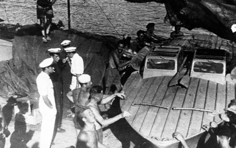 Upon arrival, the boats are unloaded, launched. In June 1942, preparations are underway at the Foros base in Crimea to launch Motoscafo Turismo Modificato’s and Motoscafo Turismo Silurante Modificato’s from a slipway.
