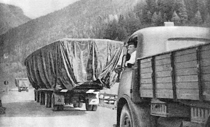 The transport operation from Venice to Vienna via Verona and the Brenner Pass proves challenging due to the size of the vessels, which measure 17 metres in length and 4.4 metres in width. Special trailers carry MAS 566, 567, 568, and 569, but engineers frequently intervene to navigate low bridges, as seen on 25 April in Oberaudorf, or to dismantle obstacles blocking the route. Analysis of photographs suggests the convoy includes Alfa Romeo 800 and OM Taurus trucks towing trailers, with additional vehicles transporting removed structures, weapons, torpedoes, and engineering support. Personnel travel in separate vehicles, possibly including a bus.