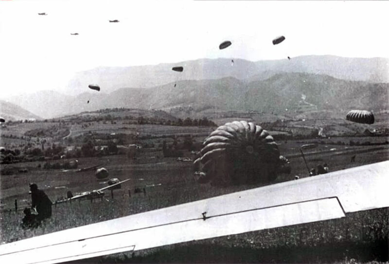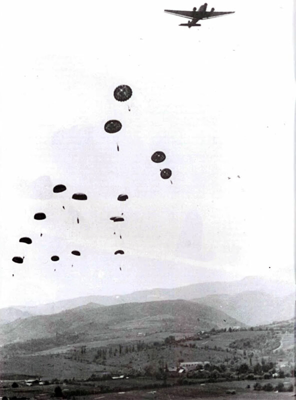 At exactly 7:00, the first Junkers-52 transport aircraft appeared above Drvar, dropping 314 Fallschirmjäger belonging to the SS-Fallschirmjäger-Bataillon 500.