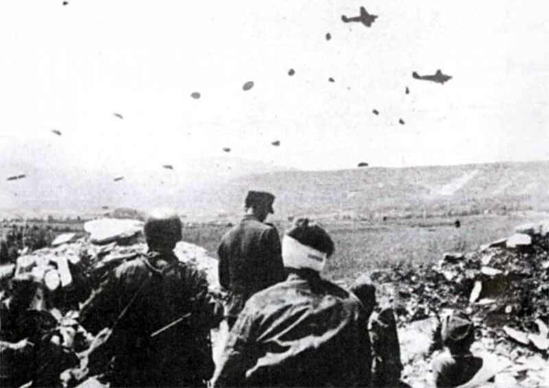 The attacks inflict heavy losses on the Germans. At the peak of the fighting, a partisan group manages to breach the German defensive ring, but they are swiftly eliminated in a counterattack by the Fallschirmjäger. As the day breaks, the partisans are compelled to retreat due to the renewed threat of German air strikes. At 07:00, twelve Ju-52 aircraft air-dropped urgently needed supplies, particularly ammunition.