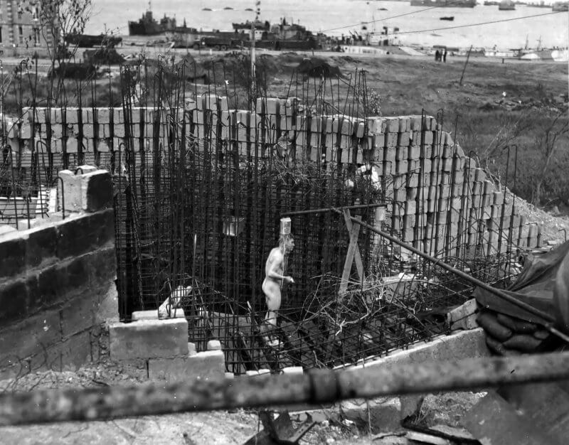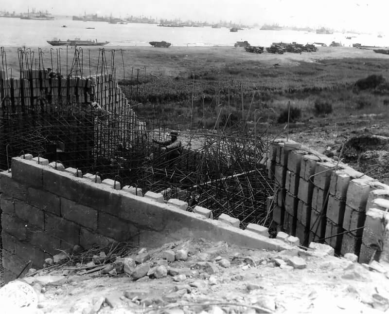 At the time of the Allied landings, these bunkers remain incomplete. The steel fixtures and weapons are either not yet installed or only partially emplaced. Observers note that pre-fabricated brickwork, filled with concrete and steel, is used in the moulds for these bunkers, an expedited technique to meet looming deadlines. Some walls show visible brick patterns in their outer faces, indicating a hybrid method of construction rather than traditional poured-concrete forms.