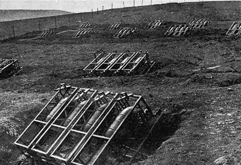 Supporting this is a battery of Schweres Wurfgerät 41 heavy rocket launch frames for 28-centimetre and 32-centimetre rockets. These static wooden frames, dug into the ground, each hold four projectiles. The 32-centimetre Flammrakete incendiary rockets have a range of about 2.2 kilometres and are designed to saturate target areas with burning oil. The launch frames are arranged in several rows and are electrically fired from an underground control bunker via buried cables. This allows multiple salvos to be discharged with a single command, sending dozens of heavy rockets towards the beach in seconds. The battery is installed only shortly before D-Day by elements of the Heeres-Werfer-Bataillon 100, making it a late but formidable addition to the Omaha Beach defences.