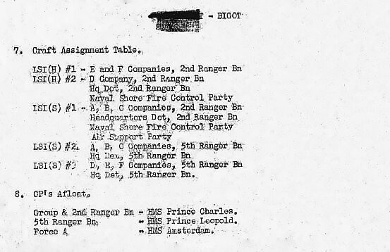 Ranger Force B embarks in two Landing Craft, Assault, numbered 418 and 1038, from H.M.S. Prince Charles. Captain Goranson travels in Landing Craft, Assault 418 with 1st Platoon under Lieutenant William Moody. LCA 1038 carries 2nd Platoon under Lieutenant Sydney Salomon. Force B is armed with M1 rifles, seven Thompson submachine guns, four BARs, two 60-millimetre mortars, and two bazookas. They carry 20 Bangalore torpedoes and 72.5 kilograms of C-2 explosives. Their LCAs lack J-Projectors, as planners assume cliff-scaling will not be required, though toggle ropes are carried as a precaution.