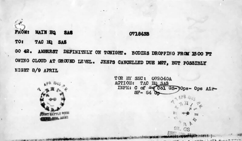 Signal communications in Operatie Amherst rely on two separate systems. Eight wireless sets drop with the force, four per battalion, one per combat company and one at battalion headquarters. These sets transmit in Morse code to the main Special Air Service headquarters in England, which relays the messages to First Canadian Army. The radio logs maintained by both headquarters represent one of the most valuable surviving sources for the operation. Each stick also carries a small receiving set for incoming broadcasts. At set times, the BBC transmits information to the sticks in the field covering the progress of Allied ground forces, the locations of other Special Air Service parties, and special instructions. Each stick operates under its own codename. In Operatie Amherst, the 3 Special Air Service uses the call sign Corbeau, and the 4 Special Air Service uses Archivistes, each combined with a number that allows instructions to be directed to individual sticks.