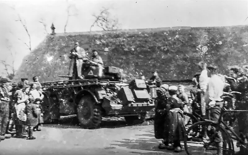 While the French Special Air Service of Operatie Amherst drop into Drenthe on the night of April 7th to 8th, 1945, the armoured reconnaissance cars of the 12th Manitoba Dragoons, officially the 18th Canadian Armoured Car Regiment, are already operating deep in the German rear south of the Hoogeveensche Vaart. Tasked with covering the left flank of the 4th Canadian Armoured Division, the Manitobas turn westward from the Hardenberg area on April 6th, 1945, driving into the exposed German flank and cutting deep into the rear of enemy forces still opposing the left wing of the 2nd Canadian Corps. The advance of the 2nd Canadian Corps is uneven at this stage. Stubborn German resistance around the IJssel towns of Zutphen and Deventer slows the left and centre of the corps, while the right flank advances rapidly. The Manitobas exploit this gap with considerable effect. Between April 6th and 11th, 1945, they take 765 prisoners.