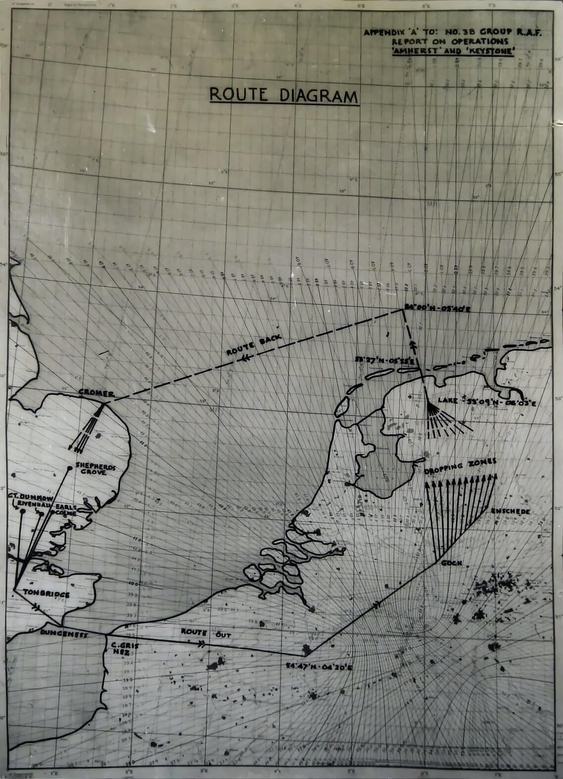 The flight route takes the aircraft across Cap Gris-Nez into liberated territory. They turn northeast over La Louvière in Belgium, approximately forty kilometres south-southwest of Brussels, and fly toward Goch and then Enschede. At intervals, each aircraft turns sharply northward toward its assigned drop zone. After completing the drops, all aircraft converge on the small lake of De Leien, north of the town of Drachten, before flying east along the island of Ameland. Over the North Sea the aircraft turn sharply left and head for England via the British town of Cromer.
