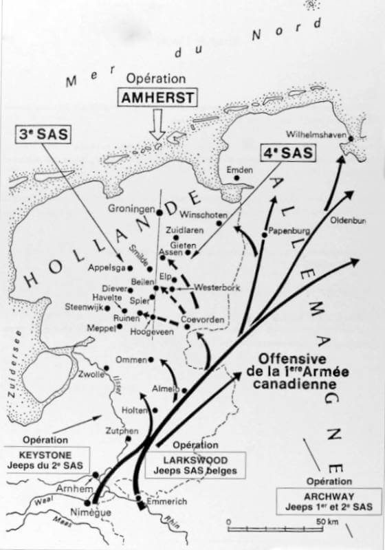 In the final weeks of the Second World War, as Allied ground forces push into the Netherlands and northwest Germany, the Special Air Service Brigade conducts four operations in the sector of the 21st Army Group. Operatie Keystone sends the 2 Special Air Service into Holland by air drop in support of the 1st Canadian Corps. Operatie Larkswood deploys the 5 Special Air Service, the Belgian squadron, on a jeep-borne ground operation in support of the 4th Canadian Armoured Division and the 1st Polish Armoured Division. Operatie Archway commits the 1st and 2 Special Air Service to a ground operation in support of the 2nd British Army. The largest of these four actions is Operatie Amherst, conducted by the French paratroopers of the 3 and 4 Special Air Service in northeast Holland in April 1945.